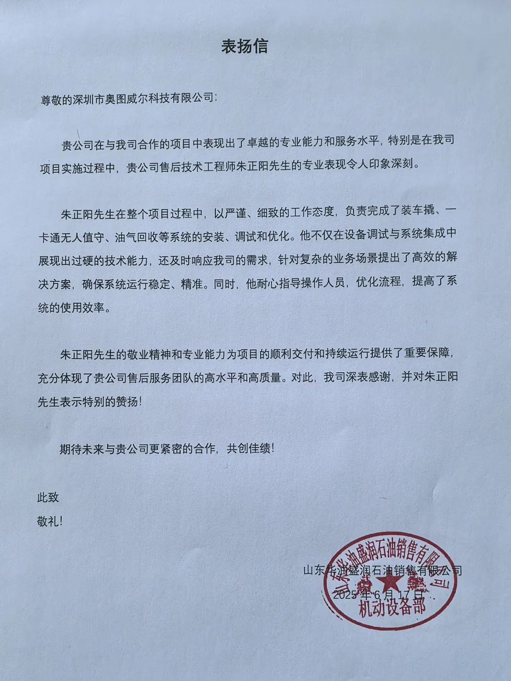 近日,深圳市奧圖威爾科技有限公司(以下簡稱“深奧圖”)售后技術(shù)部工程師朱正陽收到淄博鑫泰石化有限公司和山東華油盛潤石油銷售有限公司發(fā)來的正式表揚信,對其在項目中的卓越表現(xiàn)給予高度評價。這不僅是客戶對朱正陽個人能力的認(rèn)可,更是對深奧圖服務(wù)理念的充分肯定。